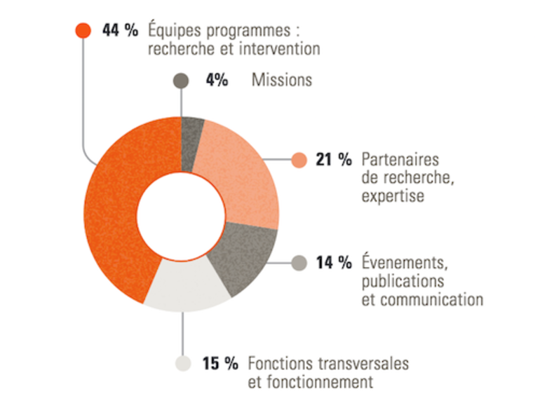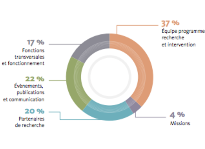 Les dépenses sont réparties entre les programmes de recherche réalisés par l’Iddri et ses partenaires scientifiques, la communication, ainsi que les fonctions transversales, charges de structure et de fonctionnement