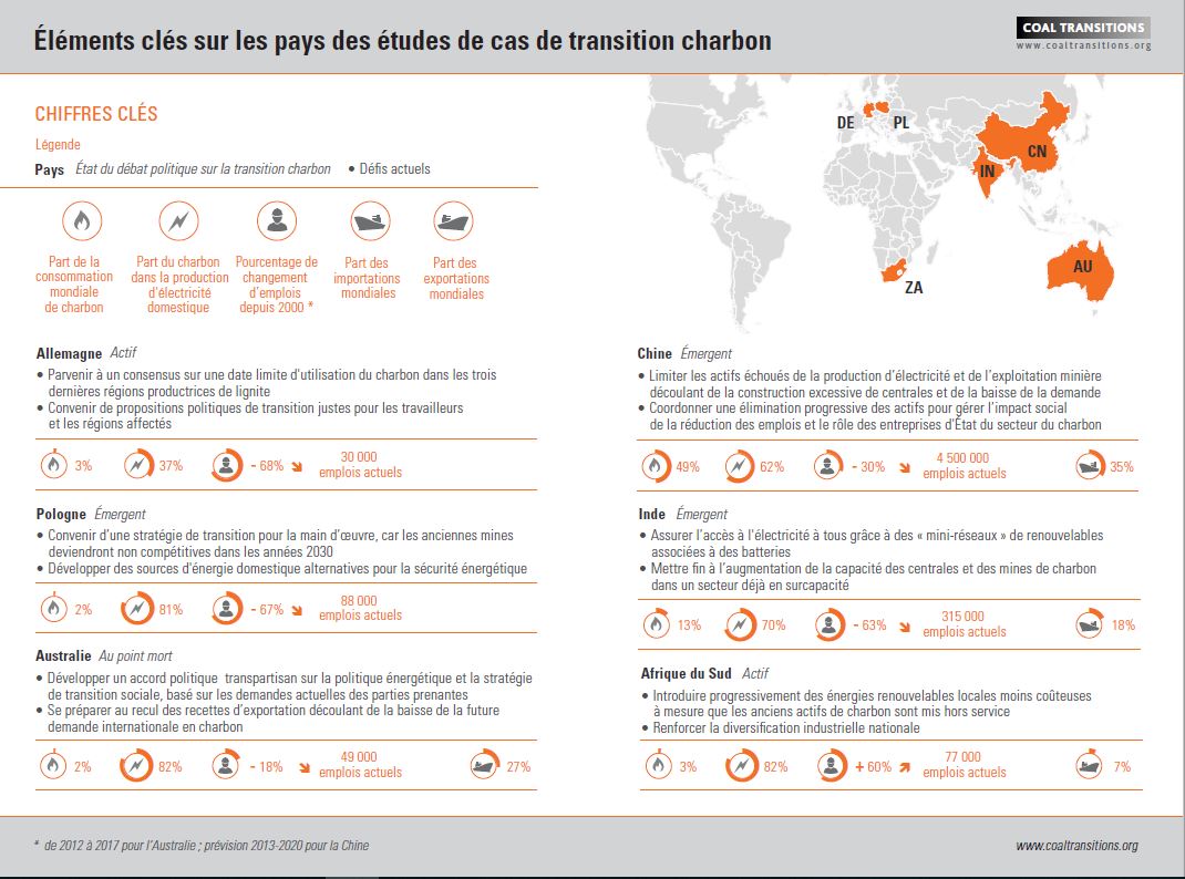 Le rapport « Mettre en oeuvre les transitions vers la sortie du charbon : enseignements tirés des études de cas sur les principales économies consommatrices de charbon » indique que :