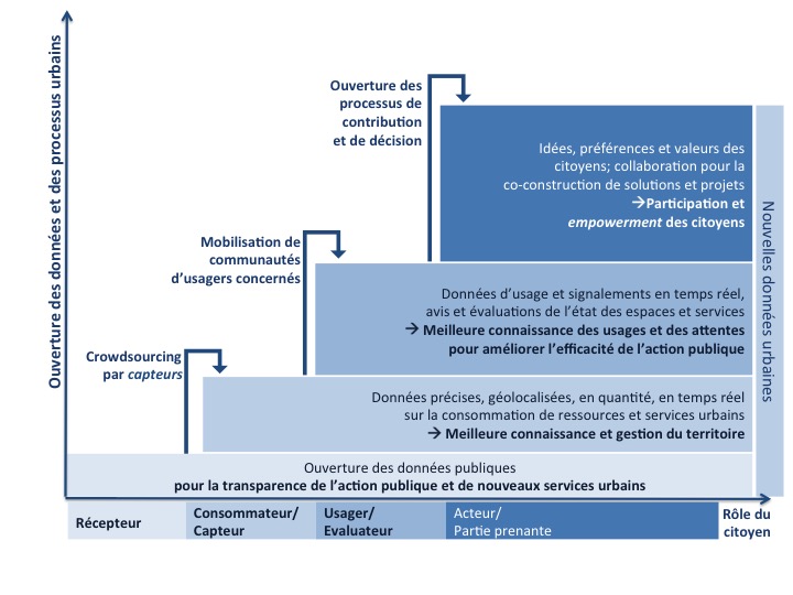 1. la production de données plus riches, en temps réel et plus détaillées peut faciliter l’optimisation et le pilotage des services urbains et donc potentiellement améliorer leur efficacité environnementale. Cela peut passer par une contribution assez passive du citoyen, considéré comme un consommateur/capteur (ex. utilisation des traces Gps pour organiser la voirie) ;