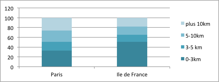 Commençons par rappeler quelques éléments sur le potentiel de développement du vélo et les gains qu’il représente en termes sociaux et environnementaux. Les apports en termes de mobilité durable du vélo sont nombreux (pas de pollution, activité bénéfique pour la santé, faible bruit, faisabilité économique, etc.) et expliquent les objectifs ambitieux que se sont fixé de nombreux territoires. De grandes villes comme New York, Londres ou Paris, ayant actuellement un très faible niveau de pratique (environ 2 % de part modale), envisagent de le doubler, voire de le tripler à l’horizon 2020 ; des villes plus avancées comme Strasbourg, Berlin, ou Copenhague (respectivement 8, 15 et 35 % de part modale) veulent pour leur part poursuivre leurs efforts. Le potentiel de développement du vélo est important, quelle que soit la ville. Et ce sont les politiques publiques structurant l’ensemble du système de mobilité qui sont ici essentielles, bien plus que les explications habituelles (culture, climat, topographie), insuffisantes pour expliquer l’histoire de la pratique du vélo, comme l’a montré l’ouvrage de F. Héran. Quelques chiffres illustrent ce potentiel (Figure 1) : la portée des déplacements en voiture réalisés à Paris et en Île de France, courts pour l’essentiel, laisse bien deviner le potentiel de cet autre mode individuel et flexible de mobilité qu’est le vélo. Figure 1. Portée des déplacements en voiture (vol d’oiseau) en 2010 (Enquête Globale Transport, 2010)